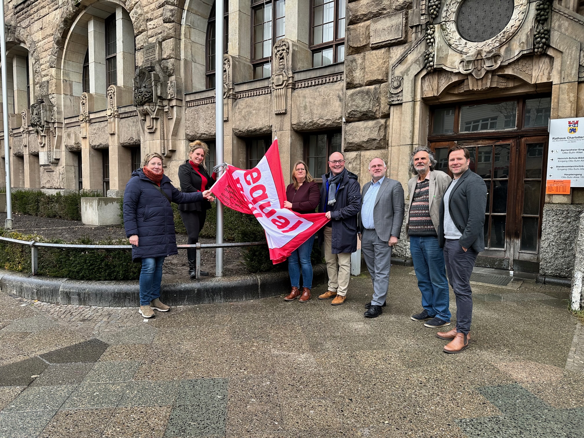 Flaggenhissung vor dem Rathaus Charlottenburg: Equal Pay Day 2023